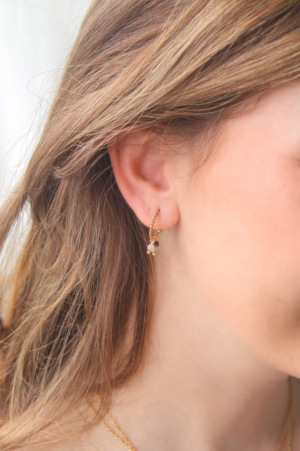 Stainless steel oorringetjes met de drie prachtige stenen Granaat, Prehniet en Kunziet. Ze vormen samen ook een hele mooie kleurencombi.