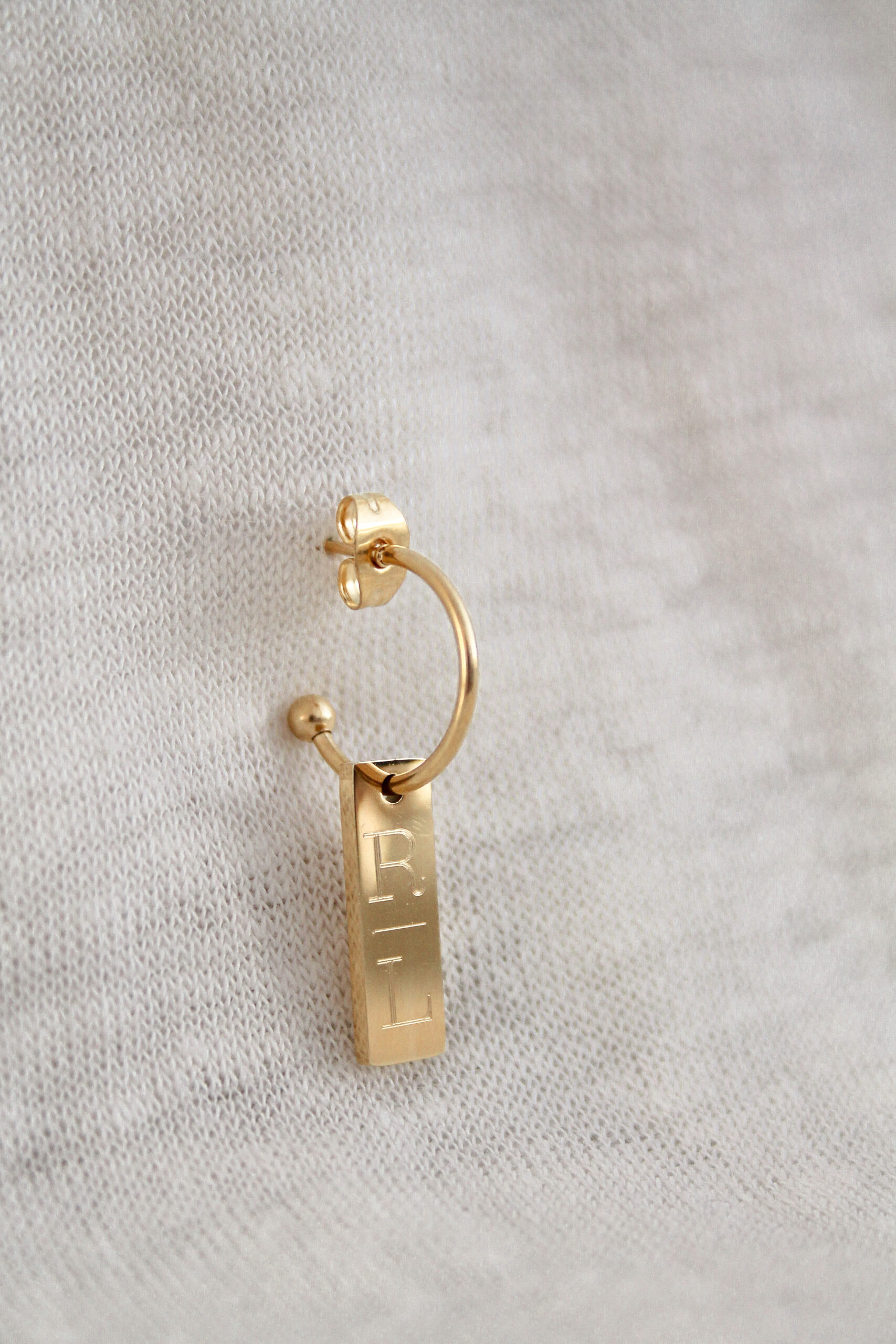 Oorringen Initialen Plaatje. Stainless steel oorring met een stainless steel plaatje. De initialen worden onder elkaar gegraveerd. Het plaatje is hoog gepolijst en glanst erg mooi!