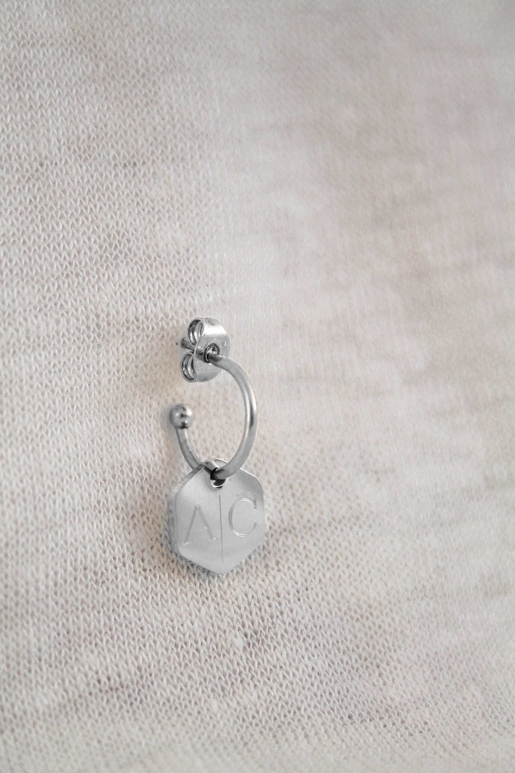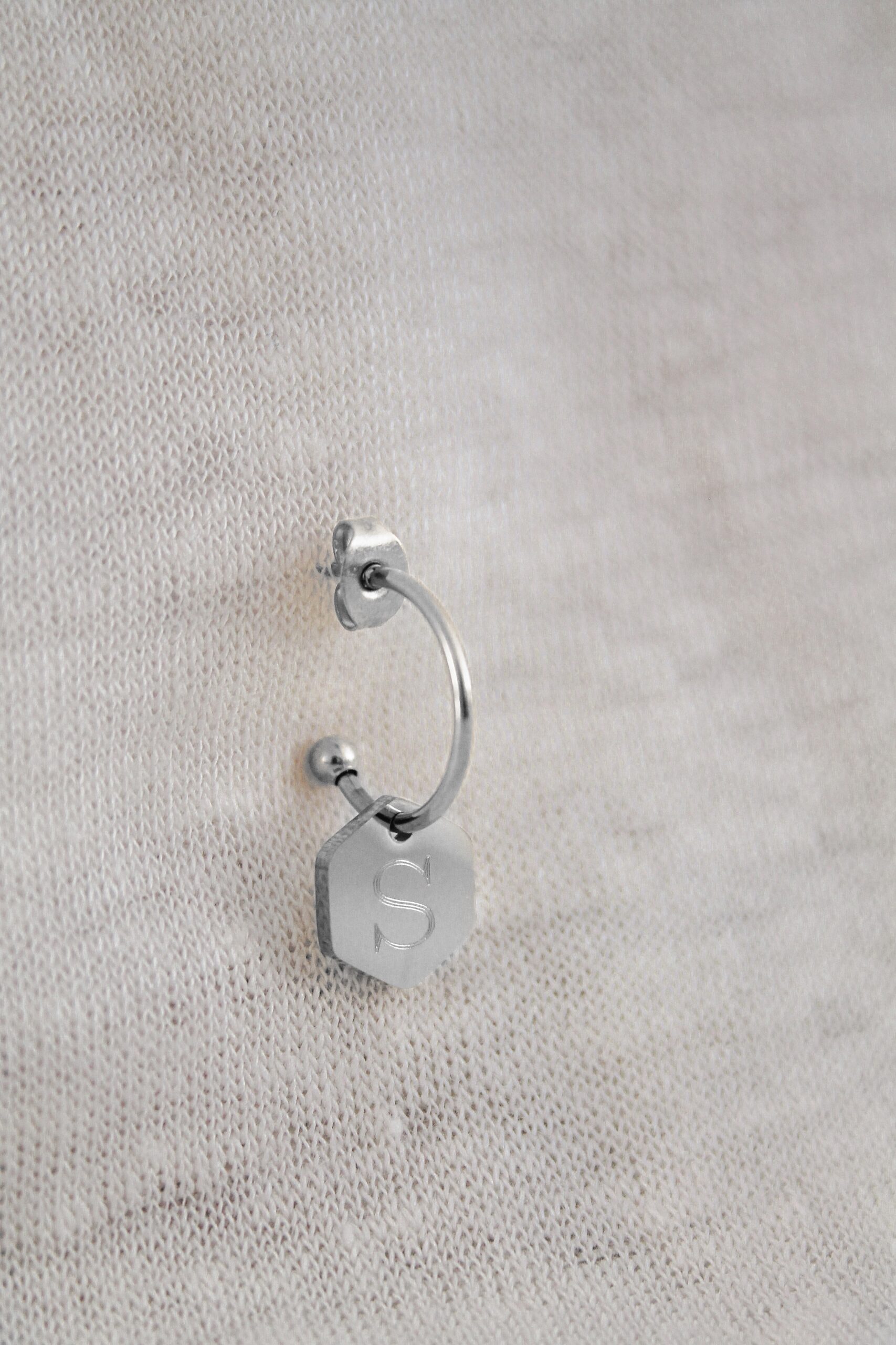 Stainless steel oorring met een stainless steel zeshoek bedeltje. Er passen 1 of 2 initialen op één bedeltje. Het bedeltje is hoog gepolijst en glanst erg mooi!