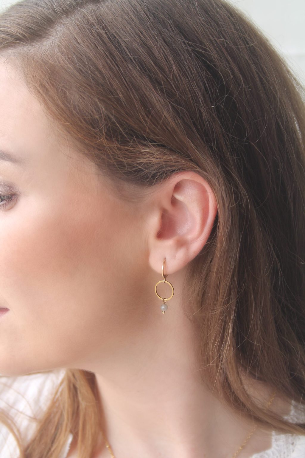 Oorringen Labradoriet. De oorringen zijn gemaakt van stainless steel met een hangertje van Labradoriet steentje. De oorring heeft een hefboompje, waardoor je de oorring gemakkelijk open en dicht kunt doen. Het ontwerp bestaat uit een ringetje met een ringetje eraan, waaraan het Labradoriet hangertje speels bungelt.