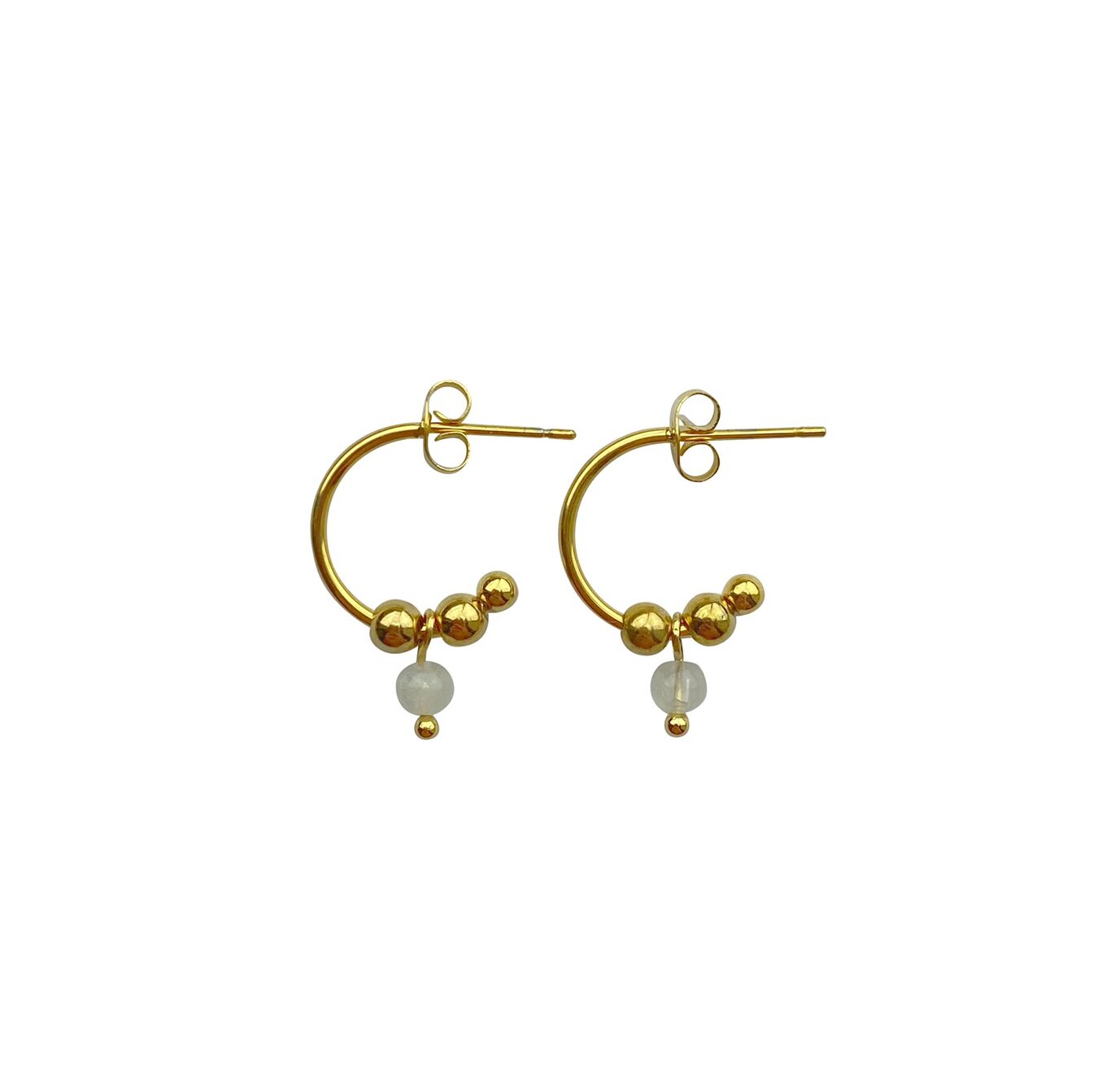 Stainless steel oorringen met een Maansteentje en twee gouden stainless steel kraaltjes.