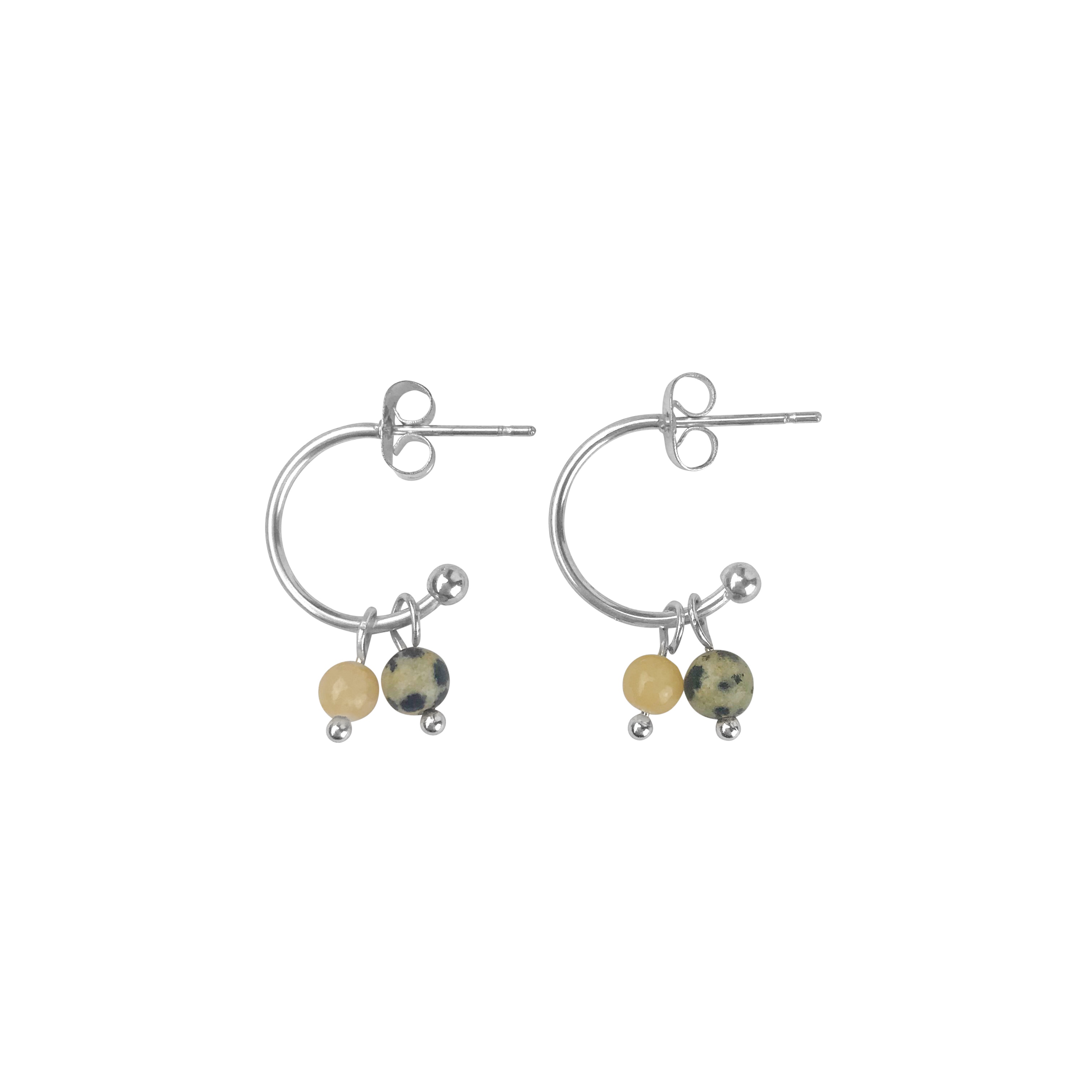 Rvs half open oorring met een Jade en een Dalmatiƫr Jaspis steentje. Het oorringetje is anti allergie, erg sterk en kleurvast.