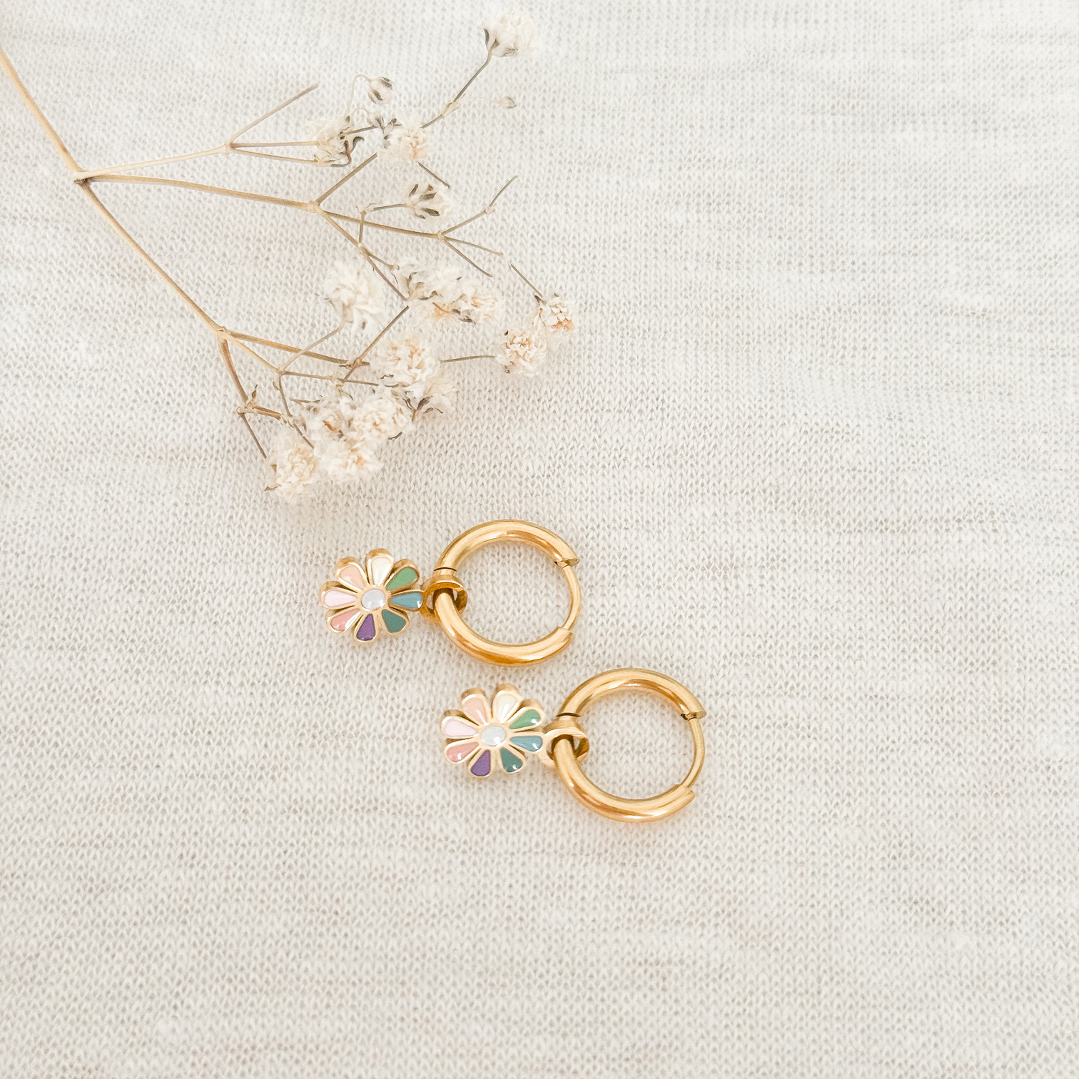Pastel Bloemetje Oorringen, gemaakt van stainless steel. Jouw nieuwe favoriete accessoire: een stainless steel oorring met een speels bloemhangertje. Het hangertje, eveneens gemaakt van duurzaam stainless steel, is een echte eyecatcher. Elk bloemblaadje heeft een andere pastel kleur.