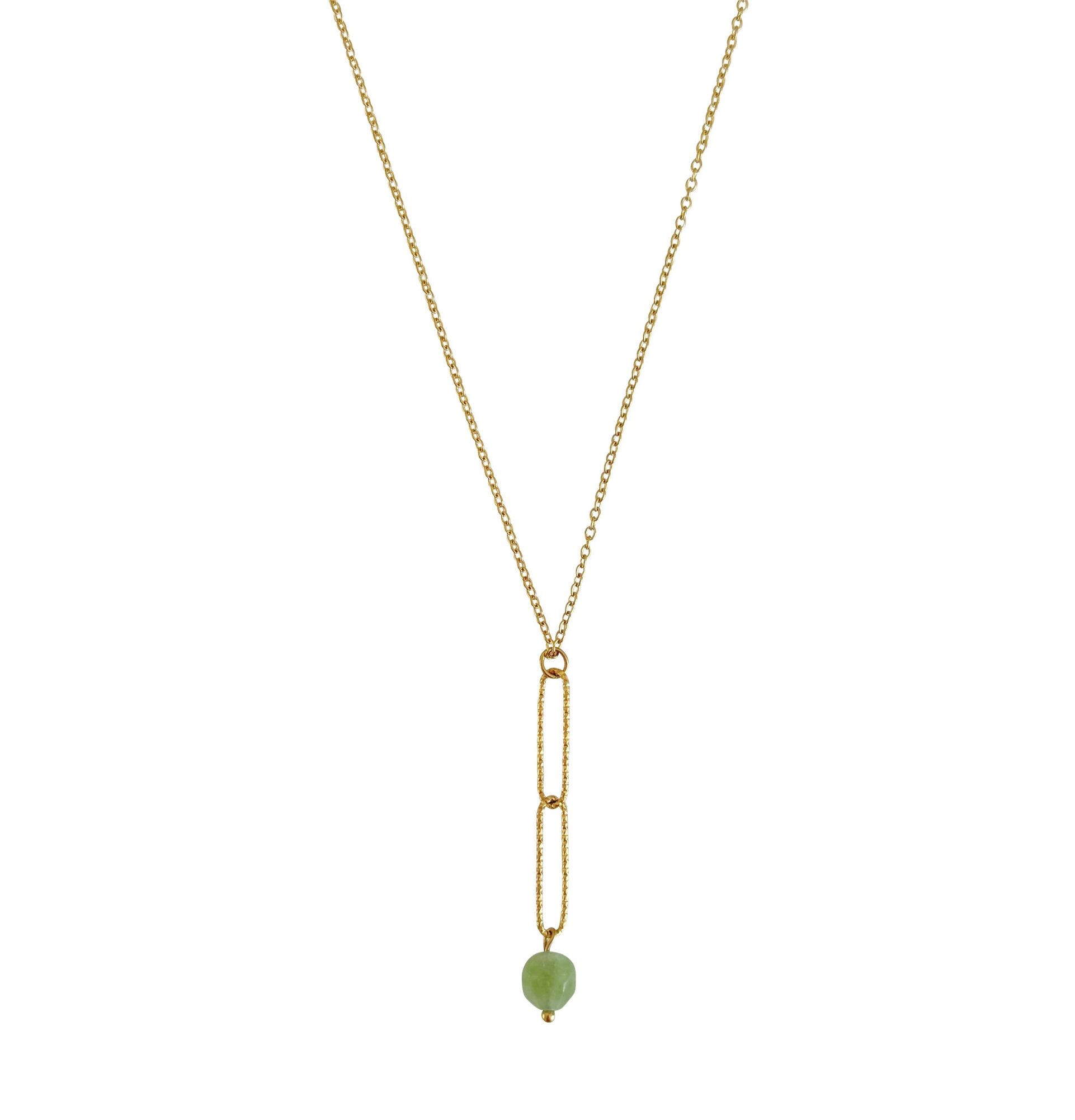 Peridot Y-Vorm Ketting, gemaakt van stainless steel. De Peridot steen is facet geslepen en heeft een mooie glinstering. De hanger waar de Peridot steen aan hang is bewerkt en heeft hierdoor een mooi reliëf.