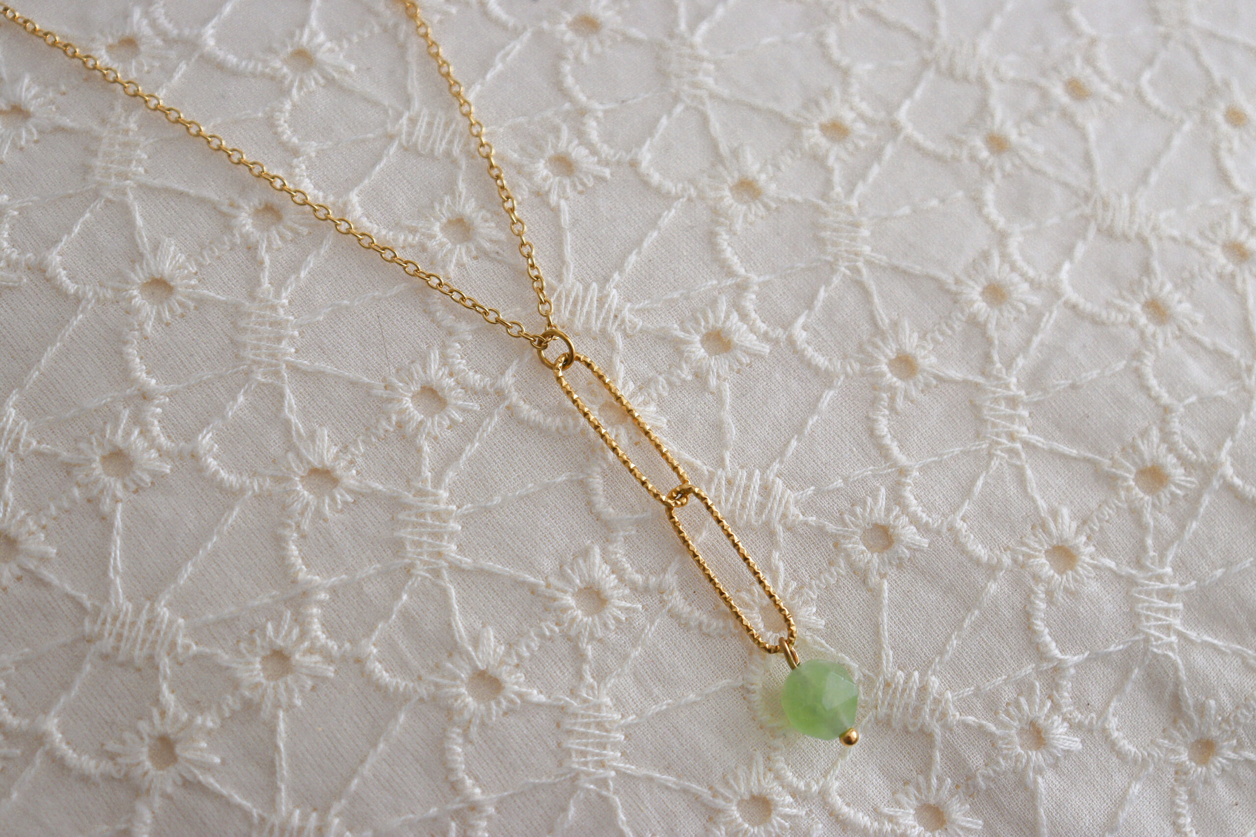 Een Y-Vorm Ketting is een ketting met een langere hanger, waardoor de ketting de vorm van een Y krijgt. Dit geeft een uniek en leuk effect, de ketting valt mooi op de borst en de Peridot hanger valt hierdoor extra op.