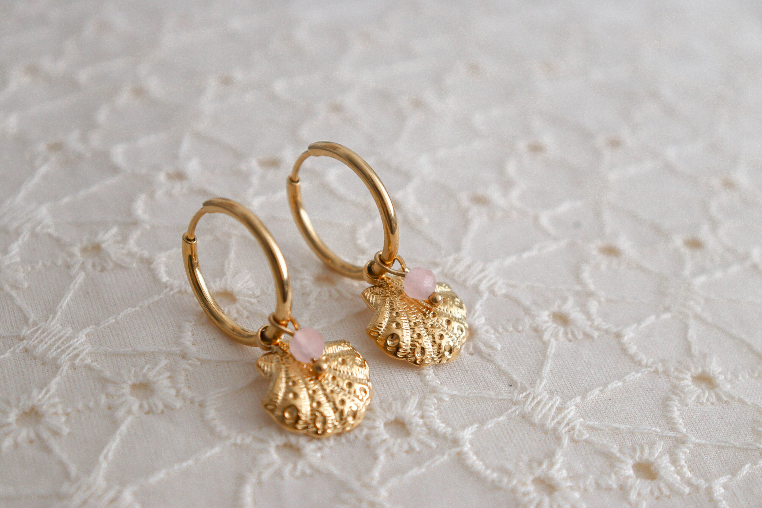 Schelp & Rozenkwarts Oorringen, gemaakt van stainless steel. De oorringen zijn hypoallergeen, sterk, duurzaam en verkleuren niet. Het Rozenkwarts steentje is facet geslepen en heeft daardoor een mooie fonkeling. Het schelp bedeltje heeft kleine details, waardoor het bijna op een echt (maar goud!) schelpje lijkt.