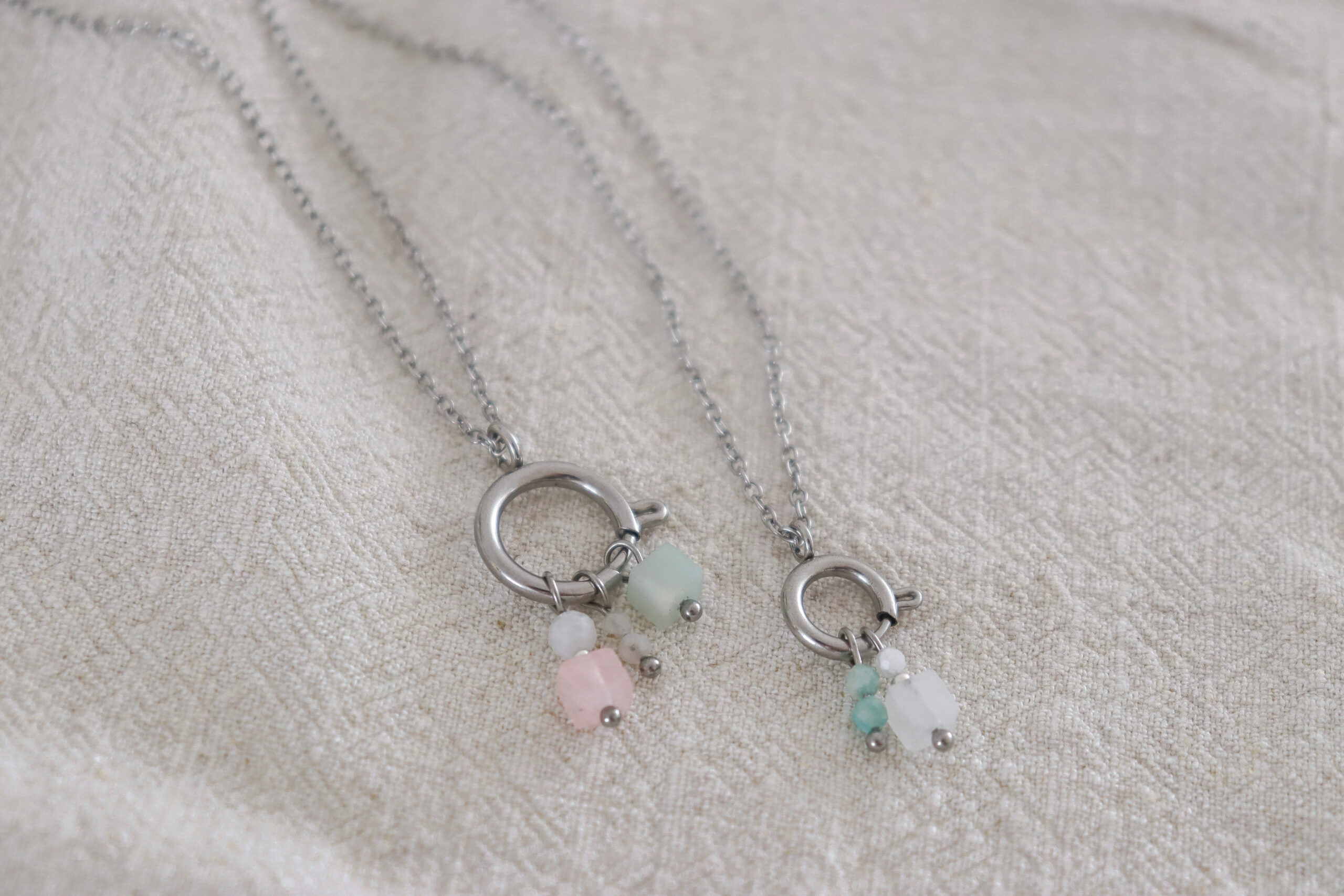 De edelsteen hangertjes aan deze ketting zijn: Rozenkwarts, Maansteen en Amazoniet.