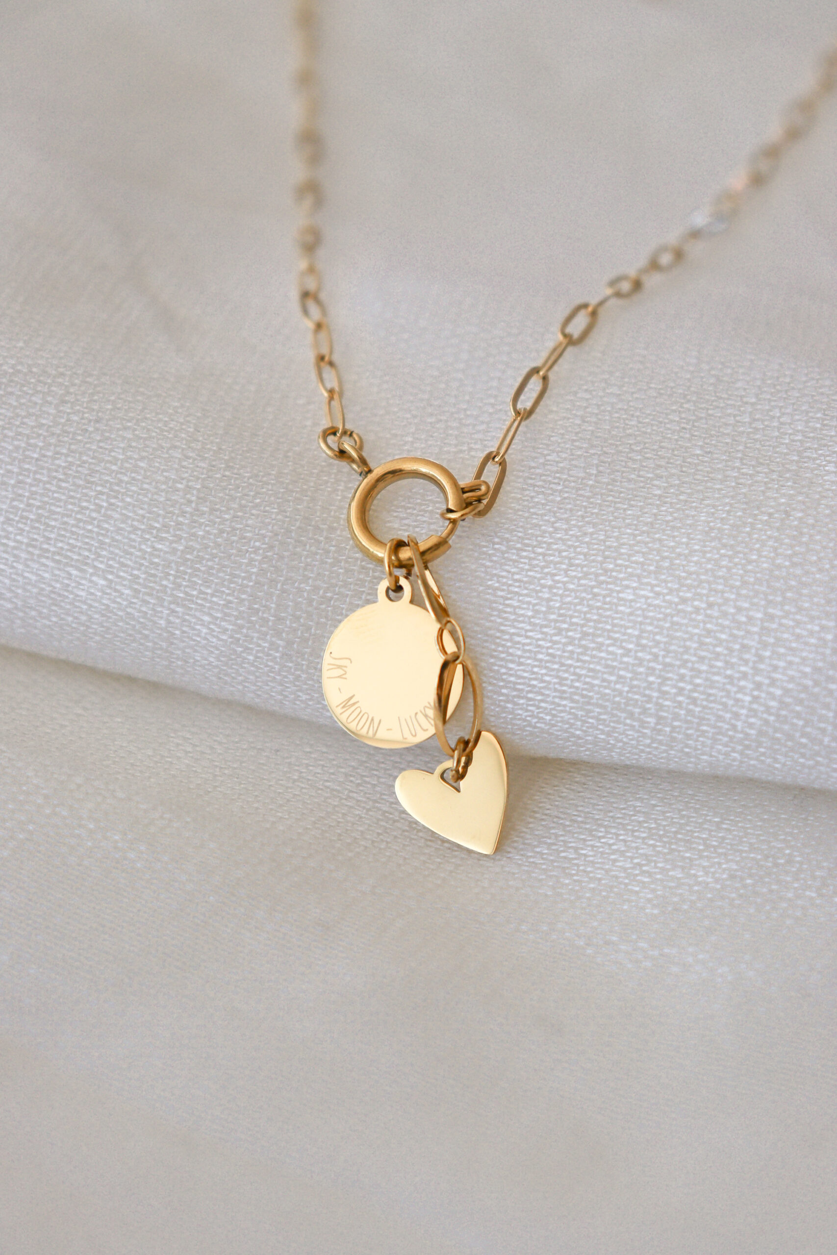 Slot Ketting Zelf Samenstellen, gemaakt van stainless steel. Je kunt kiezen voor alleen een gravure bedeltje, maar ook om daar nog meer bedeltjes aan toe te voegen. Als je kiest voor meer bedeltjes, dan maken we de gravure bedel links en daarnaast komt een hangertje aan een langer stukje te hangen. Dit maken we zo om te voorkomen dat de bedeltjes tegen het gravure bedeltje aan kunnen schuren en er krasjes op kunnen komen. Je kunt kiezen welk hartje er aan het langere stukje mag komen te hangen.