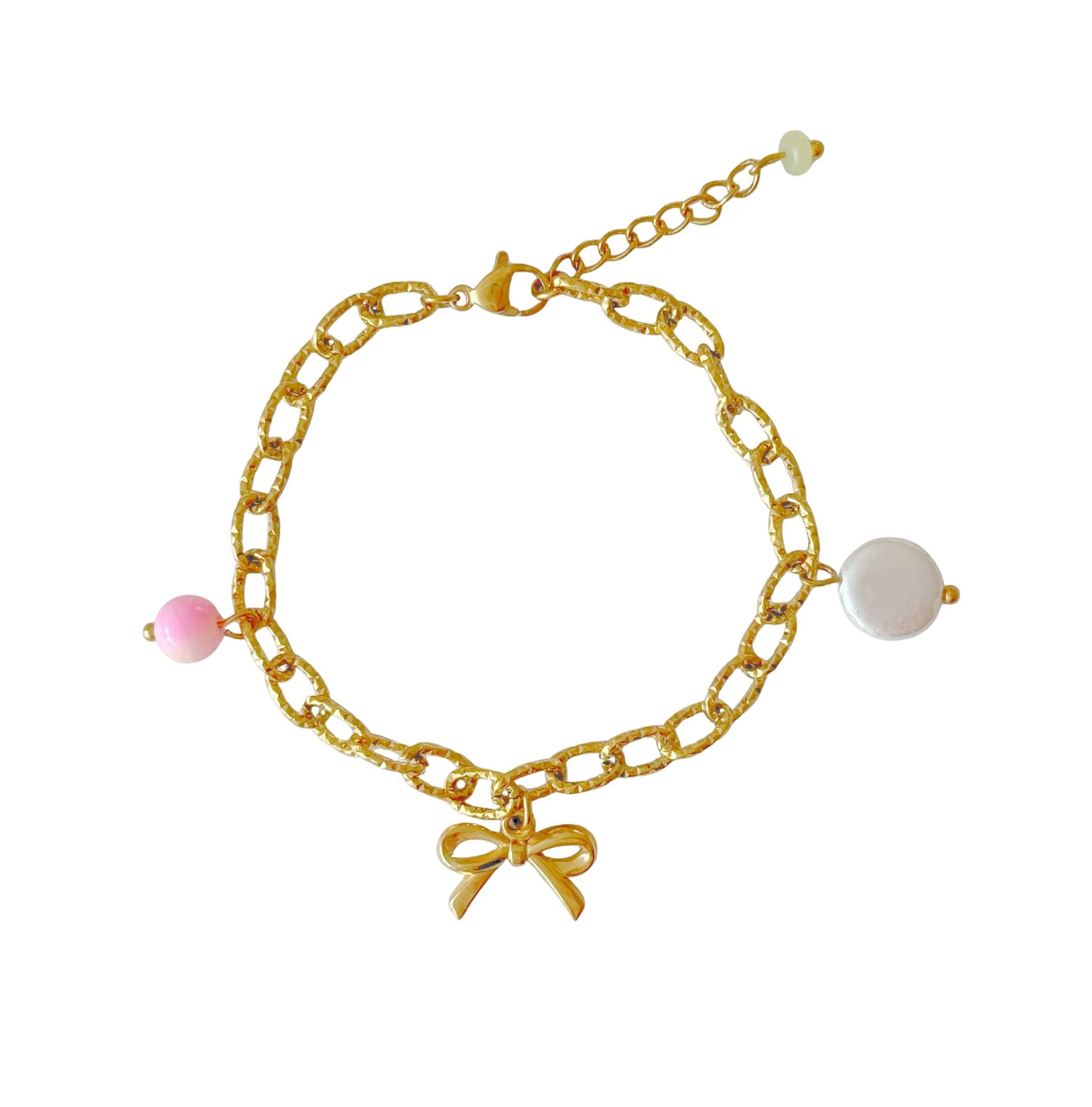 Aan de armband bungelt een ronde, platte schelp hanger die het strandgevoel tot leven brengt. In het midden prijkt een schattig strikje hangertje, dat zorgt voor een speelse, vrouwelijke touch. En om het geheel af te maken: een Perzische Jade hanger in zachte tinten roze en oranje, die prachtig contrasteert met het goud van het metaal.