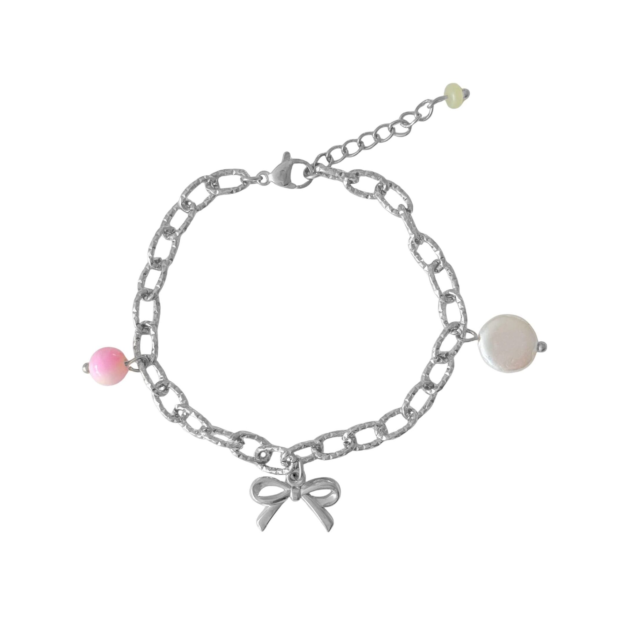 Aan de armband bungelt een ronde, platte schelp hanger die het strandgevoel tot leven brengt. In het midden prijkt een schattig strikje hangertje, dat zorgt voor een speelse, vrouwelijke touch. En om het geheel af te maken: een Perzische Jade hanger in zachte tinten roze en oranje, die prachtig contrasteert met het goud van het metaal.