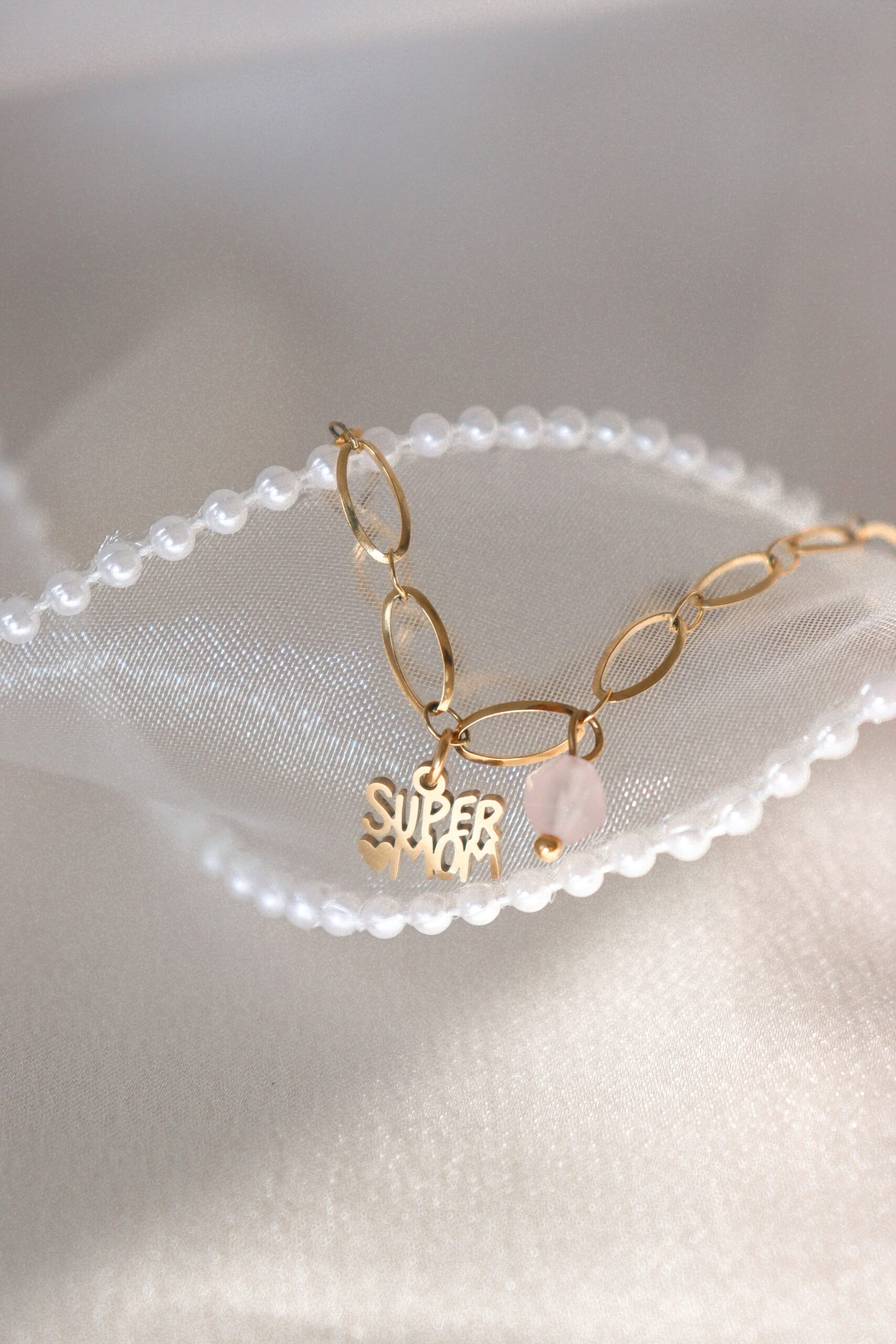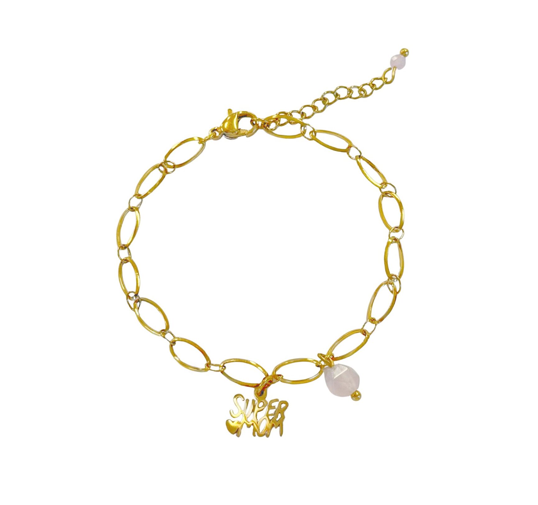 Super Mom & Rozenkwarts Armband, gemaakt van stainless steel. Een liefdevolle armband voor een super mama. Deze schakelarmband met ‘Super Mom’ bedel is een betekenisvol sieraad voor elke moeder. De stoere schakels vormen een mooi contrast met de zachte details van rozenkwarts en geven de armband een krachtige én liefdevolle uitstraling.