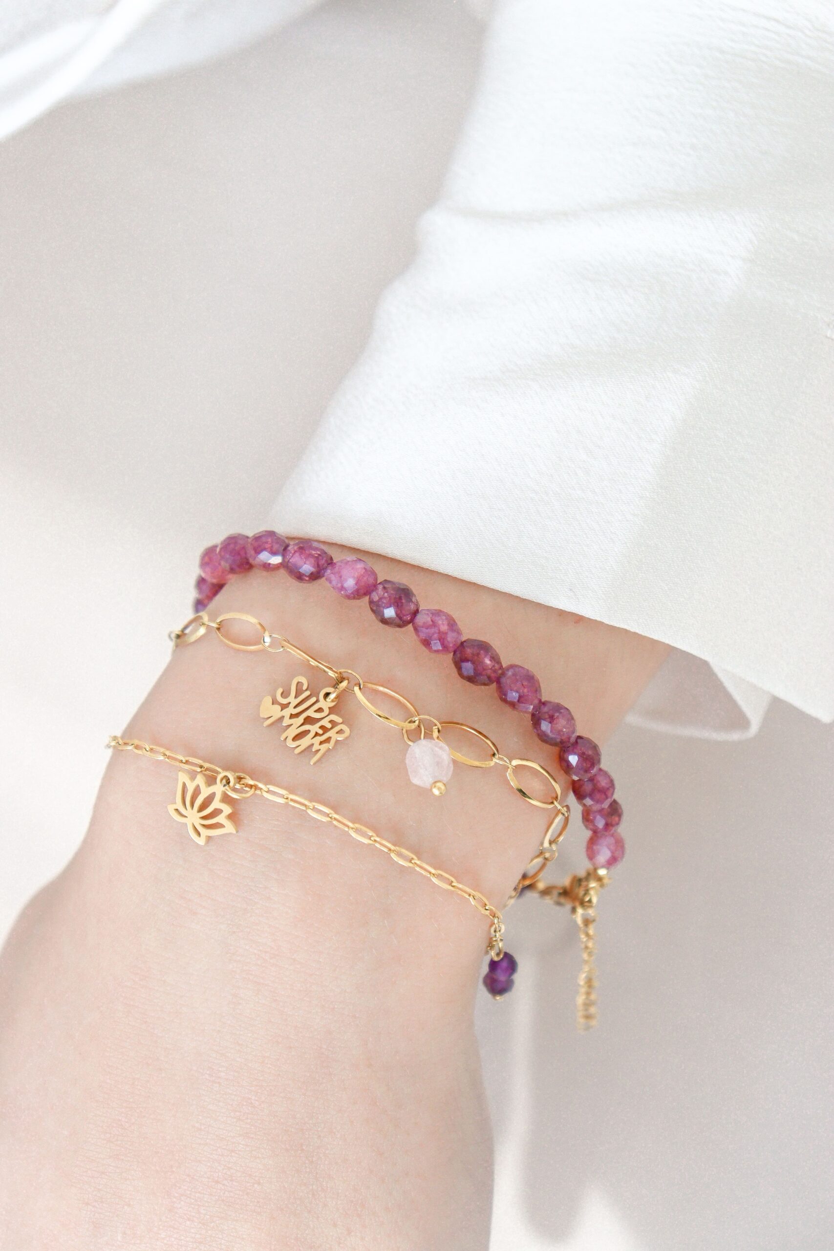 Aan het verlengkettinkje schittert een klein rozenkwarts steentje. Dit verfijnde detail maakt de armband speels en geeft het sieraad een luxe afwerking.