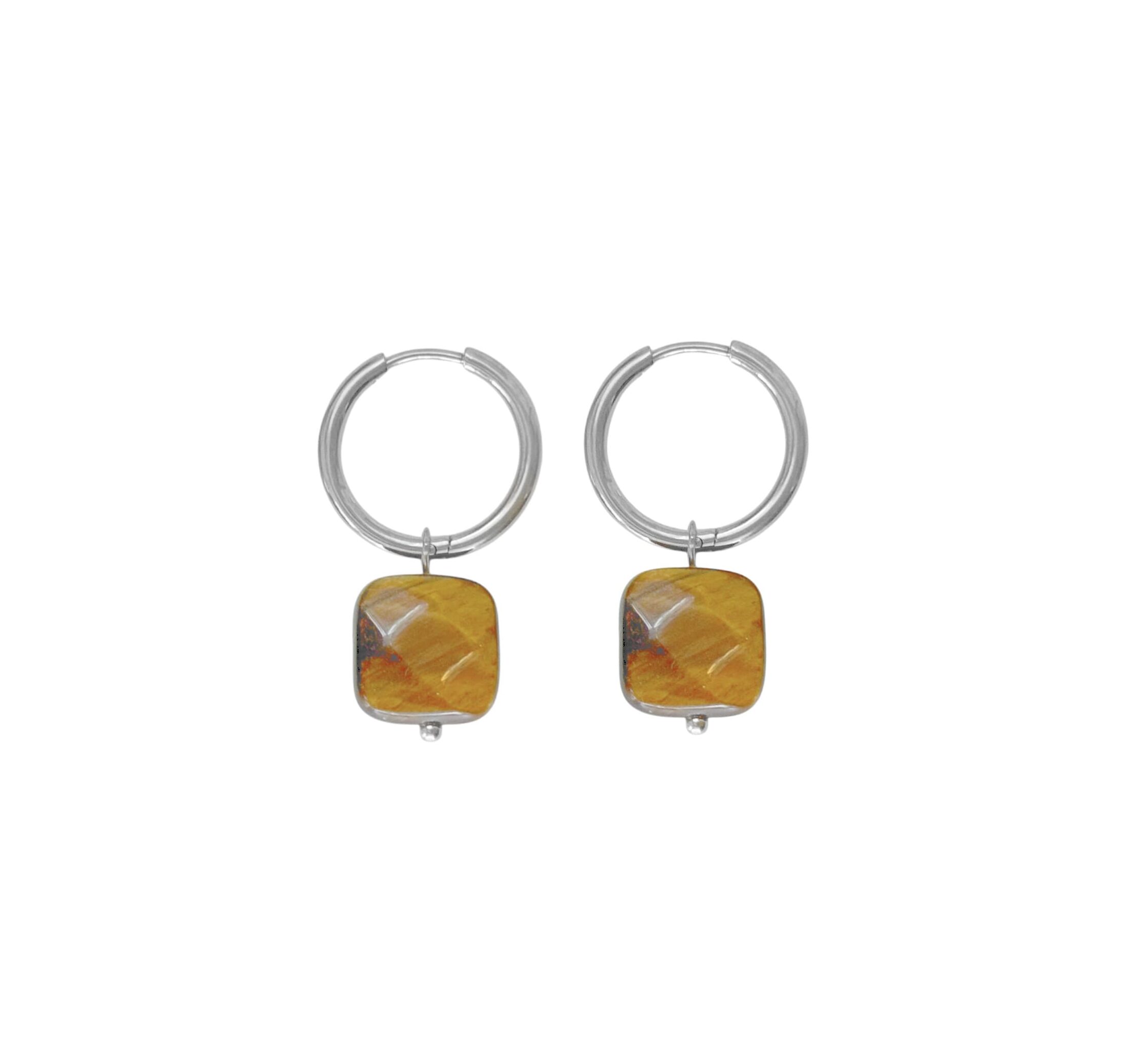Tijgeroog Oorringen, gemaakt van stainless steel. Voeg een vleugje warmte en elegantie toe aan je look met deze prachtige Tijgeroog oorringen. De facet geslepen Tijgeroog steen (12 x 12 mm) schittert subtiel in het licht en laat de natuurlijke tekening van de steen prachtig uitkomen.