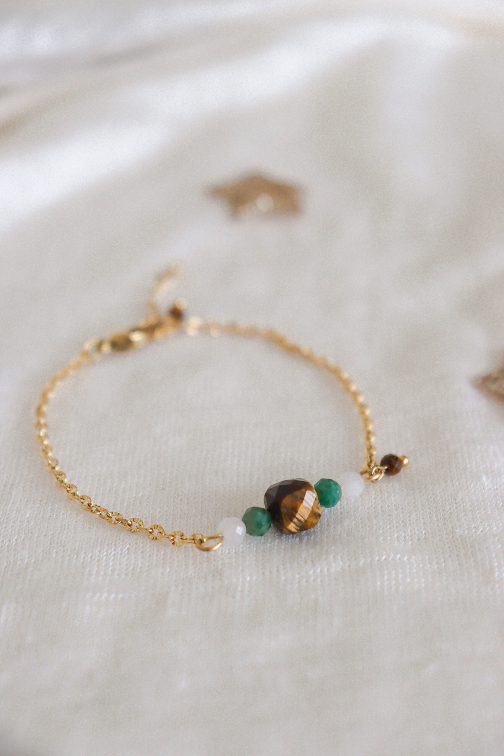 Tijgeroog & Smaragd Armband, gemaakt van stainless steel. Armband met Maansteen, Tijgeroog en Smaragd. De zachte glans van de Maansteen, het warme bruin van Tijgeroog en het diepgroene van Smaragd. Samen vormen ze een tijdloze mix die bij elke gelegenheid past. Perfect om solo te dragen of te combineren met andere sieraden.