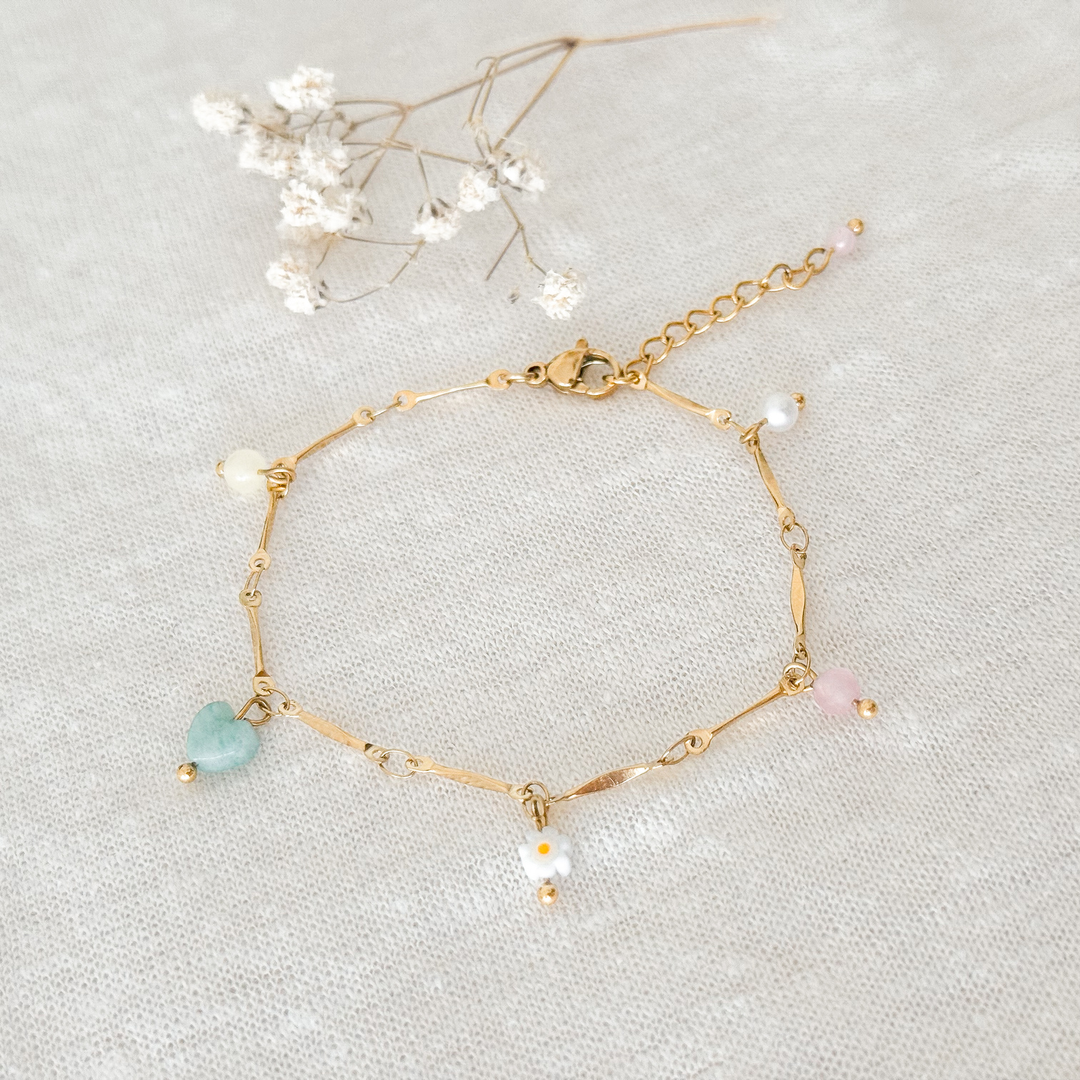 Zachtheid & Vrouwelijke Energie Armbandje, gemaakt van stainless steel. Het armbandje heeft de naam Zachtheid & Vrouwelijke Energie gekregen, omdat alle edelsteen hangertjes een zachte, rustgevende energie hebben. Die helpt bij balans, liefde, zachtheid en harmonie. zowel innerlijk als in relaties. Perfect voor wie op zoek is naar meer rust, verbinding met het hart en emotionele veerkracht.