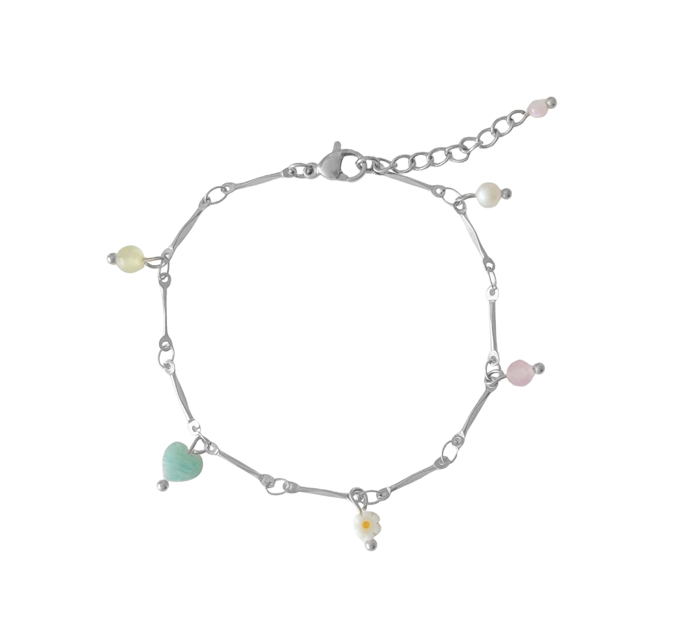 Zachtheid & Vrouwelijke Energie Armbandje, gemaakt van stainless steel. Het armbandje heeft de naam Zachtheid & Vrouwelijke Energie gekregen, omdat alle edelsteen hangertjes een zachte, rustgevende energie hebben. Die helpt bij balans, liefde, zachtheid en harmonie. zowel innerlijk als in relaties. Perfect voor wie op zoek is naar meer rust, verbinding met het hart en emotionele veerkracht.